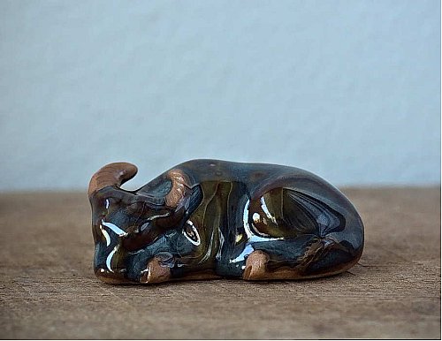 Handcrafted dark beige-blue celadon "Dog" ceramic tea pet made by Thai ceramists. Mix of Thai dark and white clay.